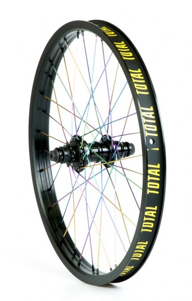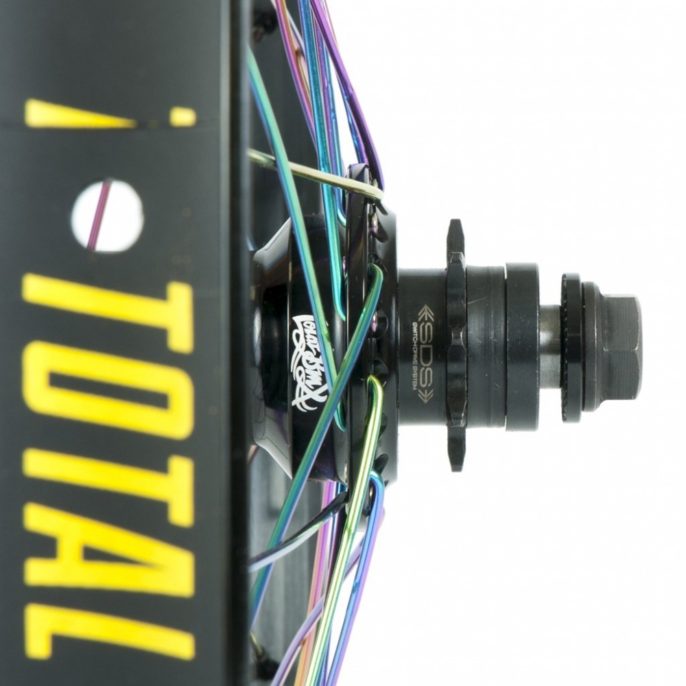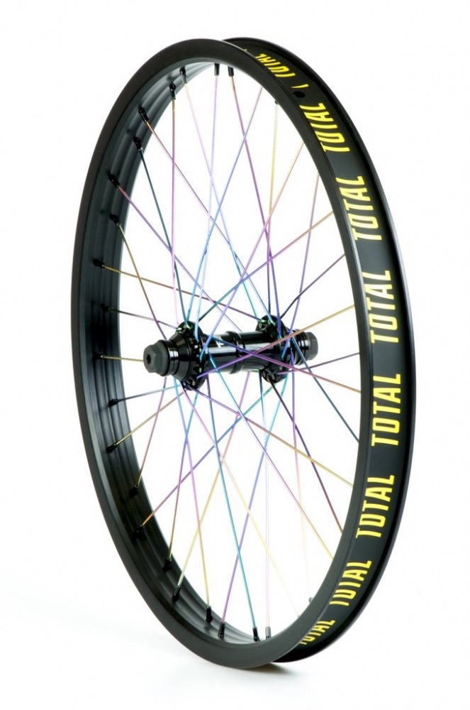 Je zapleteno 36 dvojitě zeslabovanými dráty v duhové barvě do female náboje Total bmx Tech V2. Ten se pyšní tepelně zpracovanou CrMo osou a vysoce kvalitními japonskými ložisky. K náboji lze dokoupit titanová osa a Total bmx hubguard.(není součástí) Kolo je zapleteno na ráfku Total bmx Spitfire. Ráfek je vyroben ze slitiny 6066 Al s rozměry 36 x 16 mm (šířka x výška). Vlnitý profil s dvojitou stěnou a dvojitou konstrukcí pro zvýšení pevnosti. Zesílení kolem otvorů pro niple. Výplet obsahuje pásku do ráfku a je určen především pro parkové jezdce. Hmotnost 960 gramů. Kompletní info ZDE.