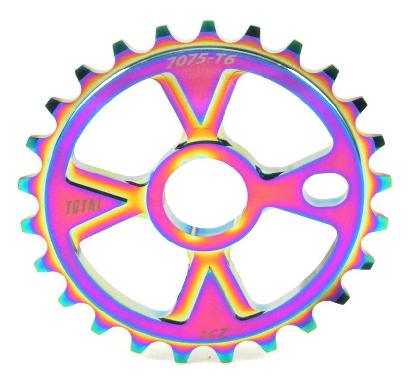 Lehký převodník od značky Total bmx. Jednoduchý líbivý design a precizní CNC zpracování. Je vyroben ze slitiny 7075-T6 o síle 6 mm. Počet zubů je 25. Hmotnost 68 gramů. Barvy černá a duhová.