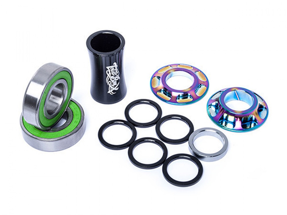 Středové složení Total bmx Team v provedení pro 19 a 22mm osu. CNC frézováno z kvalitní hliníkové slitiny. Velikost MID BB. Obsahuje 2 SB ložiska, 1 rozpěrnou trubičku, 2 prachovky a 5 vymezovacích podložek. Váha 160 gramů. Sladem v černé a duhové barvě.