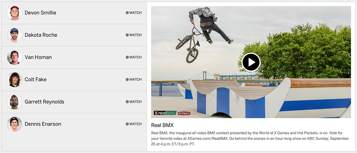 Pokud sledujete dění ve světě BMX, už nějakou dobu máte možnost hlasovat pro svůj nejoblíbenější edit v soutěži Real BMX 2016, kterou si pod záštitu vzalo X Games. Šest PRO riderů dostalo možnost natočit přibližně minutu a půl dlouhý edit a je opravdu těžké si vybrat ten jediný, kterému dáte svůj hlas.